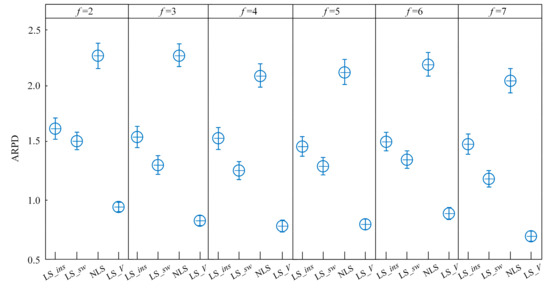 Figure 7 illustrates the mean plot, with a 95% confidence level, between the compared local search methods and factory numbers. As can be seen, LS_sw gained slightly better results than LS_ins, but the differences between them are not large enough to define the significant difference from a statistical view. The overall ARPD values of LS_V lie totally under those of LS_ins, LS_sw, and NLS without overlapping, which indicates that LS_V is significantly better than the other three metaheuristics.