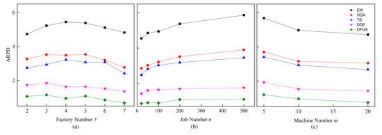 In order to investigate the differences and performance trends between the above metaheuristics comprehensively, the results in Table 6 were grouped by the influential factors, i.e., the number of factories, F, jobs, n, and machines, m, respectively. As seen, DFOA obtained the lowest ARPD values in all instances by all factors. The overall ARPD of DFOA was 0.91, which is remarkably better than that of EM (4.985), HGA (3.202), TS (2.901), and DDE (1.548).