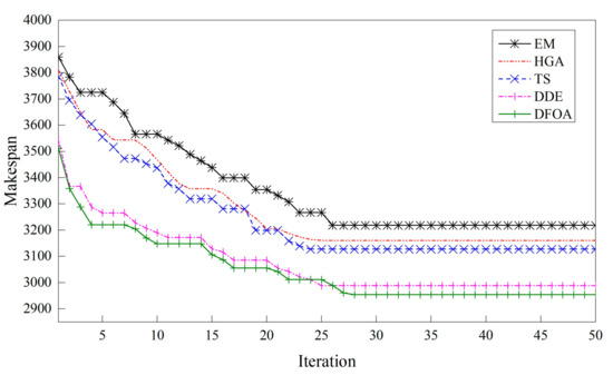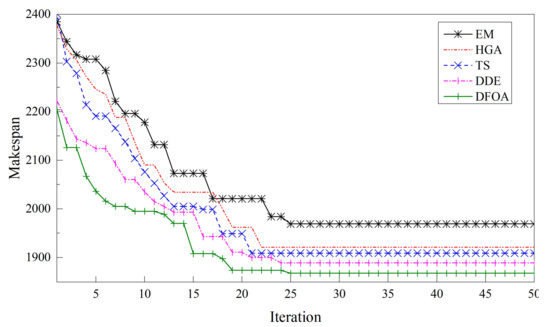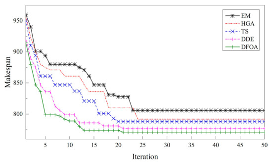 In this section, DFOA is compared with the well-known metaheuristics on large-scale instances. Since there is little literature published for DBFSP so far, some metaheuristics from DFSP literature are modified and applied for the DBFSP. The compared metaheuristics are the following: (1) The discrete electromagnetism-like mechanism algorithm (EM) of Liu et al. [24]; (2) the hybrid genetic algorithm (HGA) of Gao et al. [25], (3) the Tabu search (TS) of Gao et al. [26]; and (4) the discrete differential evolution algorithm (DDE) of Zhang et al. [34]. Not all metaheuristics in the reviewed literature are compared, as some of them are hard to replicate without accessing their original codes. Since all metaheuristics perform well and have a strong search ability, the comparison differences on the small-scale instances are not significant. Hence, only the comparison results on the large-scale instances are demonstrated.