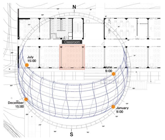 To study the glare situation in an educational space, a school classroom was selected for analysis. In South Korea, classrooms are generally oriented with windows facing south, so adjacent classrooms are in a row running to the east and west. Hongik University Girls’ High School was selected as a typical case for the glare study because the school has south-facing standard-sized classrooms. The location of the selected classroom can be seen in Figure 1.