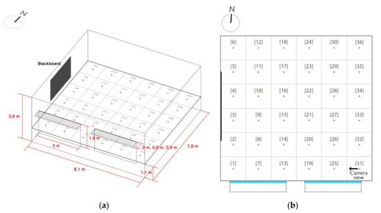 To create a three-dimensional (3D) base model of the selected classroom space, the modeling program Rhino 3D was used. The classroom was 8.1 m wide, 7.8 m deep, and 3.6 m high, and there was a blackboard on the western wall. Also, for the purposes of the study, three different shading devices were considered for the windows on the southern wall. The shading devices would be installed at the top of each window (Figure 2). The options were: No device, 600 mm of horizontal shading, and 900 mm of horizontal shading. The purpose of introducing the devices was to determine the influence of the shading depth on the glare occurrence. There were 36 analysis planes defined by dividing the inner plane into a 6 × 6 grid using DIVA for Rhino—Grasshopper. A rendering image (Figure 3) that could replace the HDR image in the direction looking at the blackboard at 1.1 m (eye-level height of a person sitting on a chair at each point) was produced in order to perform an analysis of the discomfort glare with DGP calculations, which was then totaled into monthly and annual discomfort glare (Figure 4). Figure 3 shows the size, shape, and analysis location of the classroom. Table 1 shows the types of classroom materials, which are typical in South Korea, and that were applied in the simulation.