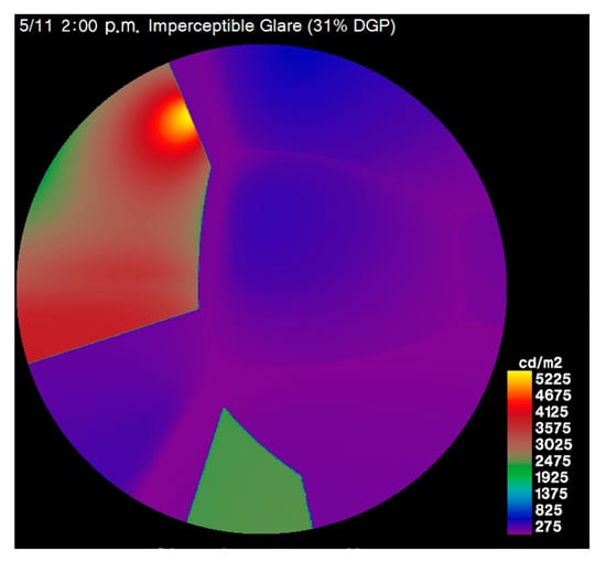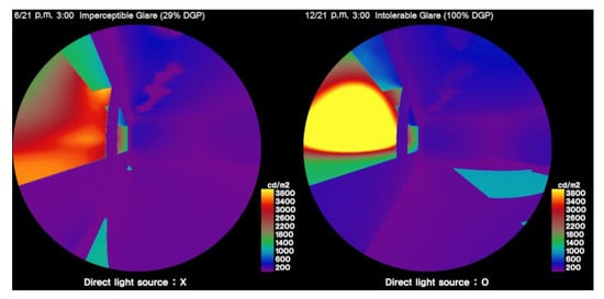 Depending on the size of the windows of the building, the brightness of the sky through the windows, and the brightness of the interior, the DGI value indicates the visual uncomfortability of people in the space. However, limitations of the DGI that result in lower analytical accuracy have been pointed out by several studies [29,30].