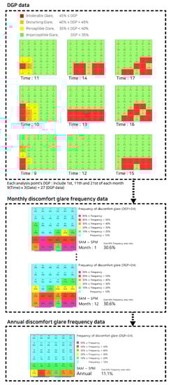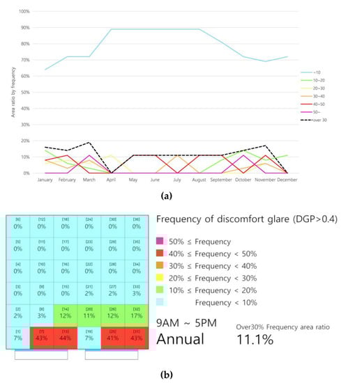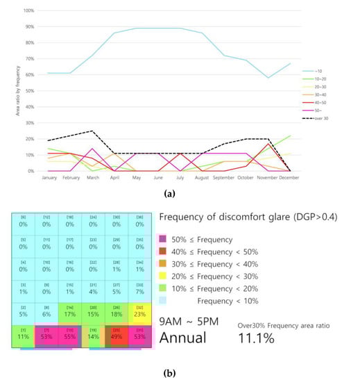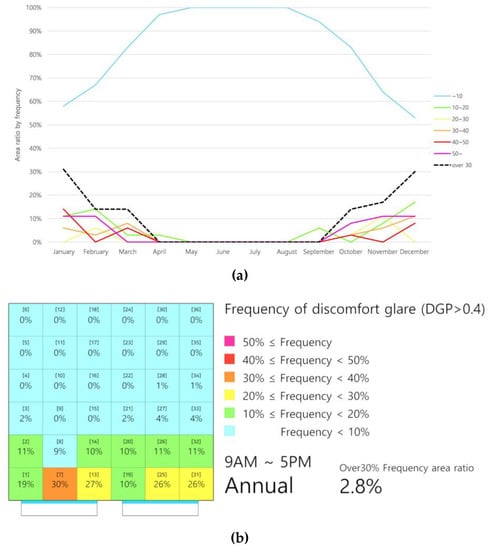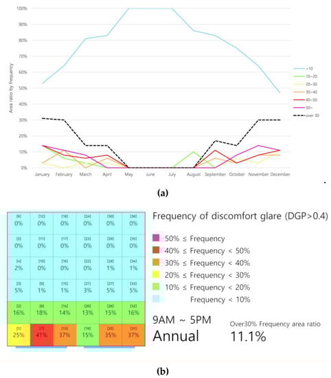 The analysis of the annual frequency of the occurrence of discomfort glare has an advantage in that it can easily show how discomfort glare occurs in an internal space for a one-year cycle of conditions. However, it is difficult to understand the case when severe glare occurs in a particular month and plan how to prevent or mitigate it since a one-year analysis is based on the average occurrence frequency of discomfort glare in a year. Therefore, it would be desirable to set up rough measures to prevent glare from the annual glare analysis and make more detailed plans by analyzing the frequency of monthly discomfort glare.
