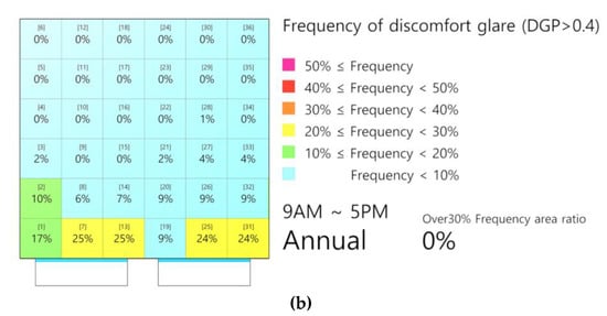 In this study, the analysis was conducted using the DGP measure. To identify discomfort glare, Wienord has proposed other methods [10,31,32,33] but also suggested several modified measures based on the DGP and set the criteria for analysis accuracy as the DGP. In addition, the DGP is considered a reliable representative glare analysis method and has been used in several studies of glare [24,34]. Therefore, in this study, the DGP was adopted as an analytical scale to identify the frequency of discomfort glare throughout the indoor space.