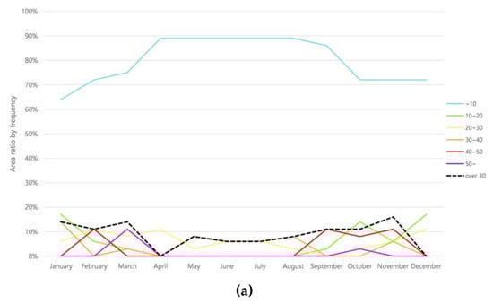The scale of DGP values can be expressed as four categories, indicating the extent to which people would typically feel uncomfortable with the glare. These are: Imperceptible, perceptible, disturbing, and intolerable. These values are divided into 5% intervals [38]. Exceeding the DGP value of 0.4 is the threshold at which one tends to feel discomfort [39]. This study also adopted this proposed scale range, and the frequency of occurrence of the DGP for each month is visualized in Figure 4. The annual incidence is also shown (Figure 5, Figure 6, Figure 7, Figure 8, Figure 9 and Figure 10). The frequency of the occurrence of discomfort glare was divided into six color-coded steps, using a 10% ratio increase. This allows easy visual recognition of how discomfort glare occurred in the interior space (Figure 4). The percentage of the internal space area per frequency is summarized in Table 3, Table 4, Table 5, Table 6, Table 7 and Table 8, and the annual frequency of the occurrence of discomfort glare is also expressed as a graph, to identify this trend. The study was divided into two parts based on a 30% frequency of occurrence. Each table shows 30% or more items in red and 30% or less in green, using the heat map method to determine which parts of the table have higher values (Table 3, Table 4, Table 5, Table 6, Table 7 and Table 8).