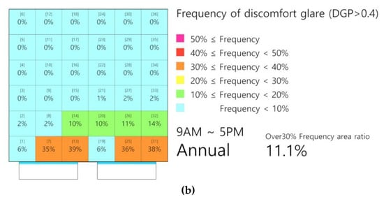Second, this study identified the location and frequency of discomfort glare over a DGP of 0.4 in the classroom’s indoor area. The visualized data can help plan the indoor space and certification evaluation for the indoor light environment to prevent glare problems. By dividing the internal space of each type of classroom into 36 analysis grids, it was possible to identify the positions where discomfort glare primarily appeared. Planning can complement the weak areas where the severe glare occurred. Also, the proposed method identified annual and monthly incidence frequencies of discomfort glare by 10% intervals with different colored indices. Therefore, by using this method, for example, one can clearly present which month has the highest frequency of discomfort glare and average occurrence frequency of discomfort glare throughout a year. The proposed method will help reduce the occurrence of discomfort glare when planning educational facilities.