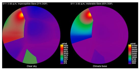 The type 1 classroom that had the clear sky condition had almost no discomfort glare from April to August, but the type 4 classroom that differed only in having the Perez sky condition confirmed that discomfort glare occurred at a very high frequency in some areas. The reason is that the luminance distribution seen at the same analysis point was quite different (Figure 11). In the clear sky condition, it was good to simulate the light environment of clear weather because it is based on sunny weather throughout a year. In terms of glare, this is a “worst” case in that it will simulate the most exposure that would be possible. However, as the light distribution along the vertical direction may not be accurate in the clear sky condition, it is possible that the luminance pattern will not appear correctly when compared to that of the actual sky [40]. Because of this, different DGP values appear in the same area when comparing the clear sky and the Perez sky.