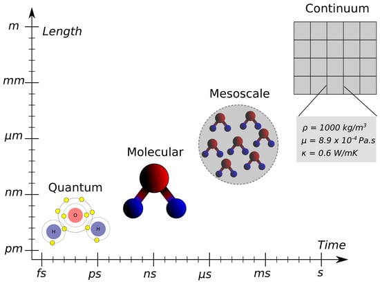 Schematic representation of different scales at which a fluid (specifically here HO) can be modelled.
