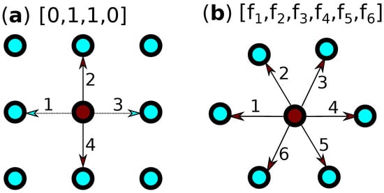 A prominent mesoscale method is the Lattice-Boltzmann Method (LBM), which approaches the problem by attempting to solve the Boltzmann Transport equation. The predecessor of LBM is the simpler Lattice Gas Automaton (LGA) [,]. In both methods, the domain is covered by a lattice. Particles can only be located at the lattice sites. Furthermore, each particle can only travel to a neighbouring vertex. Thus the velocities are restricted to the lattice directions and are represented as vectors , where d is the number of lattice vectors (see Figure 2a). The binary representation of the velocities implies that only one particle can move along a certain lattice link at each timestep.