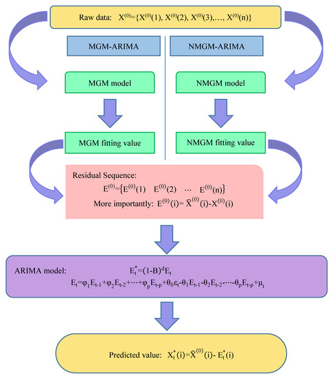 Based on three single MGM, NMGM, and ARIMA models, this study conducted a combination of models and proposed MGM-ARIMA and NMGM-ARIMA. The principle is to use the MGM and NMGM for initial forecasting, and then recalibrate the error series by ARIMA, so as to reduce the error and get more accurate prediction results. Therefore, the prediction steps for combining models include three parts. First of all, the predicted value is obtained and then the error is corrected and new error sequence is obtained. Finally, the novel predicted value can be obtained by subtracting the predicted value obtained by MGM from the new relative error time series.