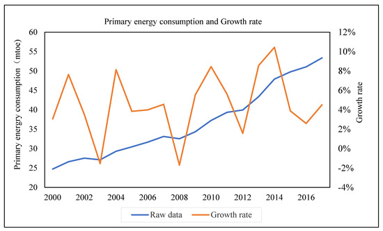 Figure 2 shows the primary energy consumption in East Africa and the growth rates from 2000 to 2017 (data from the BP Statistical Review of World Energy 2018). The data demonstrates that the overall trend in primary energy consumption in East Africa is increasing. Since 2008, the overall trend has remained relatively stable.