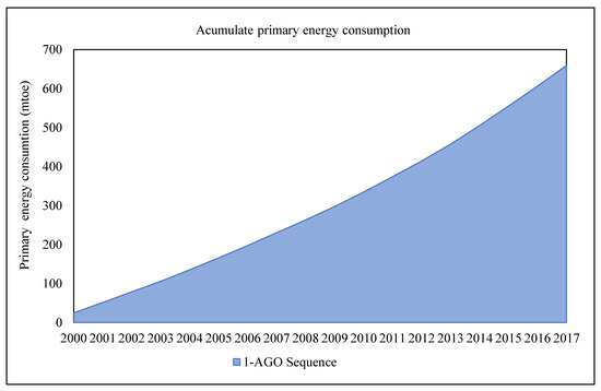 In the second step, the accumulated sequence is used to establish the differential equation, and as mentioned in Equation (4), the parameters “a” and “b” are calculated by the least square method, as shown in Table 3.