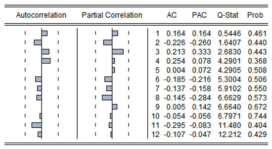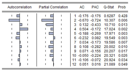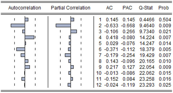 ARIMA model requires smooth raw data. To stabilize the data, the unit root test, autocorrelation function (ACF) and partial autocorrelation function (PACF) can be the tool. In this work, Eviews 7 was used to obtain the order of the difference required, that is, the value of “d”. As shown in Table 5, the first-order difference is performed on the original data. If the test value is less than three critical values, data series pass the square root test. Therefore, the value of “d” is determined to be 1.