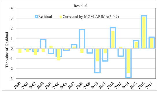 To get more accurate results, the ARIMA model of time series model in data mining and analysis tool IBM SPSS statistics is used to model, and after continuous testing, MGM-ARIMA (3, 0, 9) model is selected, and the required data is shown in Table 9. For comparison, we put the relative error of MGM and corrected error into Figure 6. Figure 6 shows that the relative error of MGM becomes smoother after correction by the ARIMA model, indicating that the MGM-ARIMA model is more accurate than the MGM model.