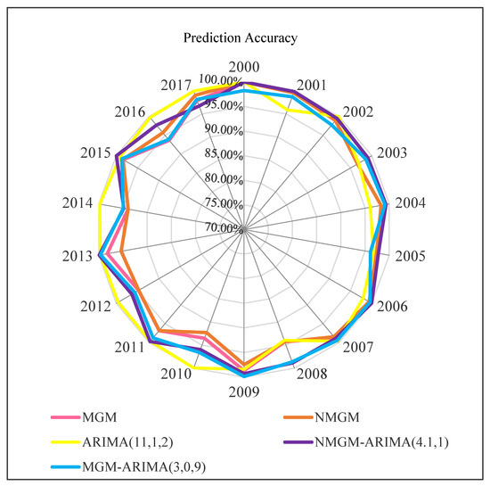 (2) For more accurate prediction, various prediction methods have been developed and used in this study. On the one hand, NMGM (non-linear metabolic grey) forecasting model was proposed by integrating the power coefficient and metabolic principles to GM model. On the other hand, the improved grey model and ARIMA model are combined by the strategy of secondary modeling, thus resulting in MGM-ARIMA and NMGM-ARIMA models.