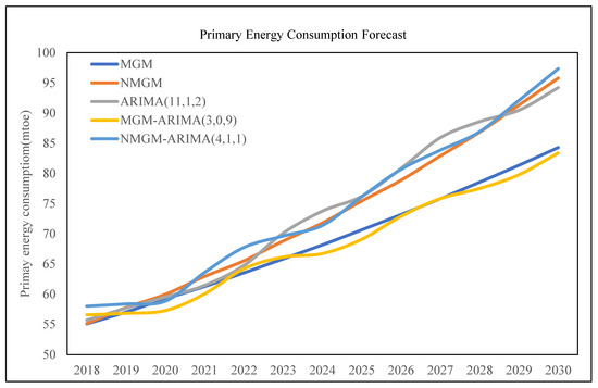 From the above analysis, the prediction results obtained by these five models have high accuracy. In this paper, the primary energy consumption in East Africa from 2018 to 2030 can be predicted Table 16 shows the forecast results of the five models. Figure 12 shows the predicted results of the five models.