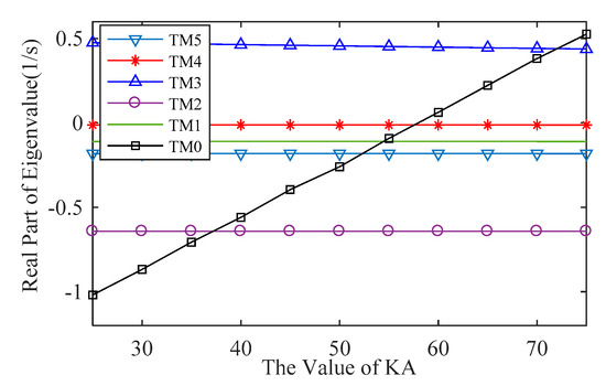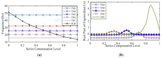 - The series compensation level has the greatest influence on the torsional mode damping of the system. With the increase of , one or more torsional mode damping will appear negative, indicating that the system may have a single mode or multimode SSR, and the greater is, the lower the torsional mode frequency is, but the change of does not affect total damping of the system, that is, the total damping of the system is conserved.
