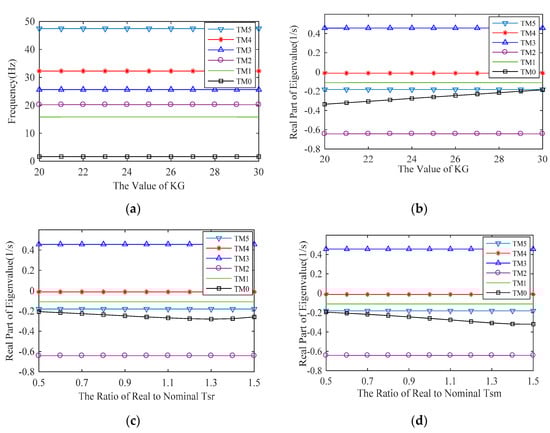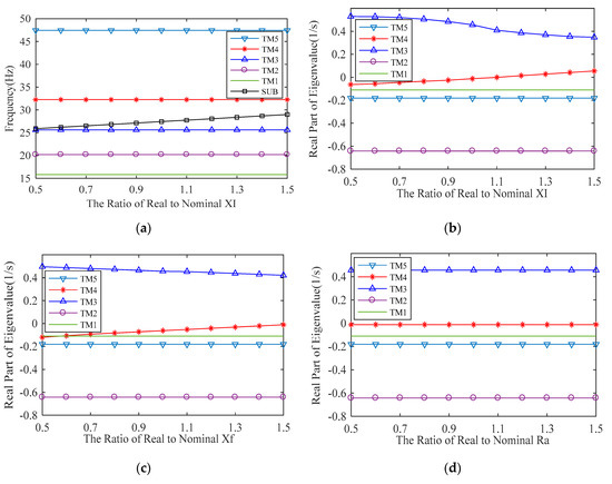 - The parameters of the synchronous generator will not affect torsional mode frequencies of the turbogenerator shaft, and the reactance parameters of generators have a certain influence on torsional mode damping of the system. The variation of the reactance parameters may lead to instability of the torsional mode when and become close. However, the damping of adjacent torsional modes will be increased, which is beneficial to its stability. In addition, the resistance parameters of synchronous generator have little effect on the damping of each torsional mode, which can be ignored.