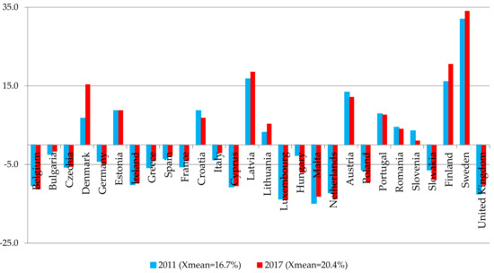 According to the Energy Roadmap 2050 that was signed in 2011, EU countries should achieve the goal on the share of RES in total energy consumption of more than 25% in 2050; however, in 2020 it should be 20% [7]. Thus in 2017, among 28 EU countries, the share of renewable energy sources (RES) in Hungary decreased by 0.7% compared with the 2011 year (14%). However, with the increasing of the share of RES in EU countries as a whole from 13.4% in 2011 to 17.5% in 2017, the level of regional dispersion increased, particularly for Belgium (share of RES in the 2017 year, 9.1%), Luxembourg (6.4%), Netherlands (6.6%), Poland (10.9%), and Slovakia (11.5%) (Figure 1). For the years 2011–2017, the highest level of average annual growth rate of RES was obtained by Malta (31.95%); however, it should be highlighted that the general level of RES of 7.2%, which was the f RES at 7.2%, was one of the lowest in the EU member states; the United Kingdom was 19.42%.