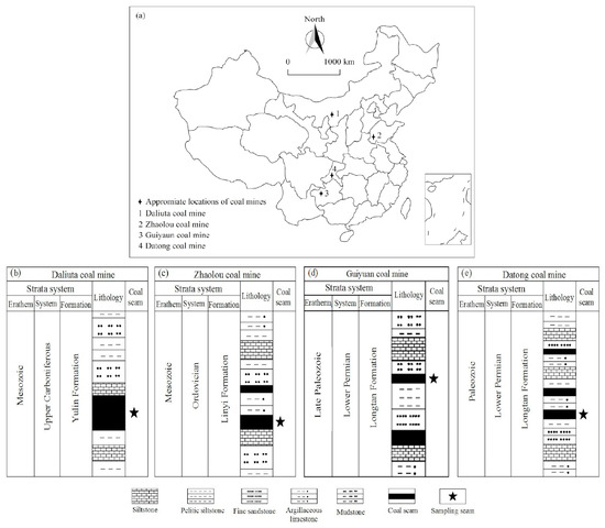 The information of the sampling coal mines: (a) location, and (b–e) stratigraphic column.