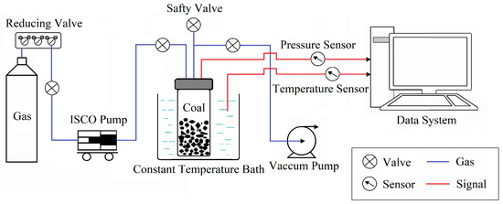 In this study, the raw coal samples were firstly saturated to ScCO2 and then further tests were conducted to compare coal properties alteration before and after ScCO2 exposure. A specific high-pressure sealed vessel was fabricated and used to saturate the coal samples with ScCO2 as schematically shown in Figure 2. The heart of this apparatus are pressure cells, an ISCO (260D) syringe pump (Teledyne ISCO, Lincoln, NE, USA) and the data system. The sample was first inserted into the pressure cell with a temperature-controlled thermostatic water bath with an accuracy of ± 0.1 °C. Then, CO2 was injected from the gas cylinder into the sample cell by the ISCO syringe pump. Prior to interaction, the system was degassed under vacuum at 60 °C for 12 h. The reaction pressure was set as 16 MPa, with a constant temperature value of 40 °C, simulating CO2 injection into deep (~800 m) coal seams [17]. The exposure time was set at 30 days to ensure a sufficient coal–ScCO2 interaction. After the saturation period, the sample cell was gradually de-pressurized by 0.1 MPa/min to avoid possible damage to the coal samples. The coal samples were then covered with plastic wrap to avoid any possible changes to the saturation state. All the tests were repeated three times to increase the confidence level and reliability. The average data of three tests were used in this study.