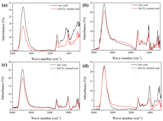 Fourier transform infrared spectroscopy (FTIR) spectra for the raw and ScCO2-treated coal samples: (a) DL coal; (b) ZL coal; (c) GY coal; (d) DT coal.