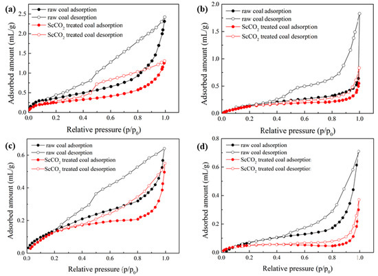 The adsorption-desorption isotherms of N2 on the raw and ScCO2-treated coal samples at −196 °C are shown in Figure 4. All the isotherms correspond to the type IV isotherm of IUPAC classification [30]. This type of isotherm is considered to be associated with the distribution of mesopores in solids [31]. Distinct adsorption-desorption hysteresis loop is observed in each isotherm at a high relative pressure (>0.45). The presence of the hysteresis loop suggests that capillary condensation occurred within the mesopores. The shape of the hysteresis loop is a reflection of pore morphology within the coal matrix [32]. As shown in Figure 4, there is only a slight difference in the shape of the hysteresis loop in the isotherms between the raw and ScCO2-treated coal samples. It can be deduced that interaction with ScCO2 has a minimal influence on pore shape in various rank coals. This is consistent with previous studies [33,34].
