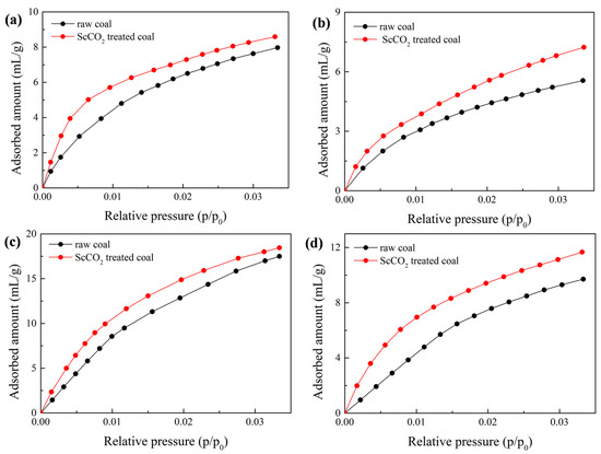 Figure 5 shows the adsorption isotherms of CO2 on the raw and ScCO2-treated coal samples at 0 °C under a low relative pressure (≤0.033). A comparison of Figure 4 and Figure 5 reveals that, for various rank coals, the adsorption capacity of CO2 is larger than N2 at the same relative pressure due to the accessibility of CO2 molecules to the narrow micropores of coal matrix in comparison with N2 molecules. Figure 5 shows that the low-pressure adsorption capacity of CO2 on the ScCO2-treated coal samples is higher than that on the raw coal samples. This observation suggests an increase of accessibility in the micropores after ScCO2 exposure, potentially attributable to the micro-fracturing of the coal matrix with ScCO2 exposure, as demonstrated by Hol et al. [21].