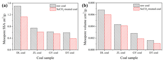 Mesopore specific surface area (SSA) and volume of the raw and ScCO2-treated coal samples: (a) mesopore SSA; (b) mesopore volume.