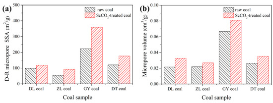 D-R micropore SSA and volume of the raw and ScCO2-treated coal samples: (a) micropore SSA; (b) micropore volume.