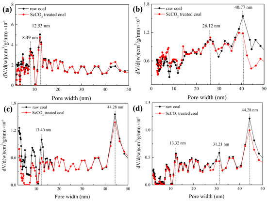 Pore size distribution (PSD) for the raw and ScCO2-treated coal samples determined by N2 adsorption: (a) DL coal; (b) ZL coal; (c) GY coal; (d) DT coal.