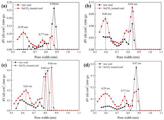 PSD for the raw and ScCO2-treated coal samples determined by CO2 adsorption: (a) DL coal; (b) ZL coal; (c) GY coal; (d) DT coal.