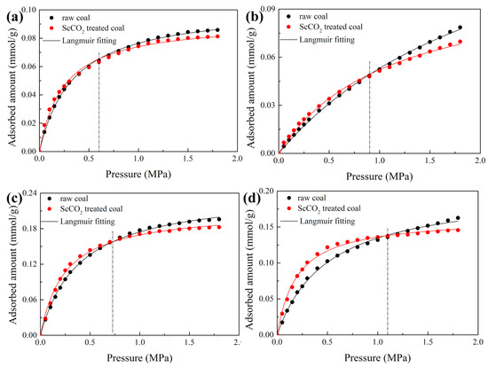 Adsorption isotherms of CO2 on the raw and ScCO2-treated coal samples at 40 °C and the fitting curves by Langmuir model: (a) DL coal; (b) ZL coal; (c) GY coal; (d) DT coal.