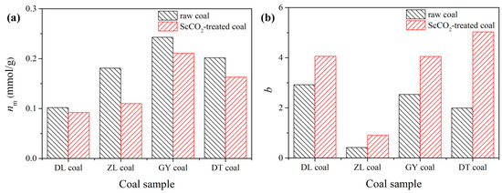 The fitting parameters for the isotherms were determined by Origin Lab software and the best-fit results are summarized in Table 3. The adsorption isotherms were well fitted by Langmuir with R2 greater than 0.99 for all cases. The values of nm for the raw coals are larger than the ScCO2 treated coals, as seen in Figure 11a, indicating a decrease of monolayer ability after ScCO2 exposure. As mentioned above, this may be due to the reduction of the surface functional group density with ScCO2 exposure. Unlike nm, the values of b for the coal samples were increased, as seen in Figure 11b, suggesting that the monolayer ability can be attained at a lower pressure after ScCO2 exposure.