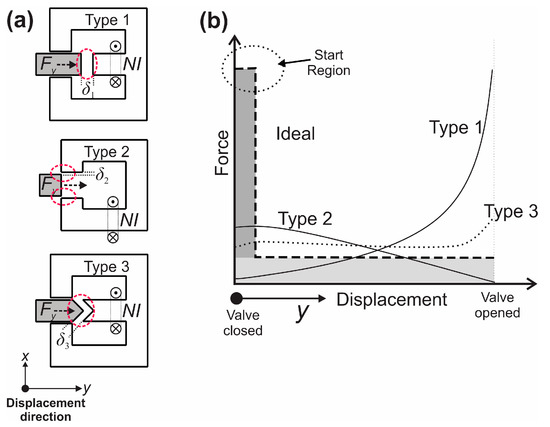 Figure 1a illustrates the working principles of the conventional electromagnetic valve actuators (without permanent magnets). Depending on the electric current based magnetic flux density component that was used for the actuation, the conventional electromagnetic actuators can be classified, as follows: Type 1—based on the normal component of the magnetic flux density in the air-gap (