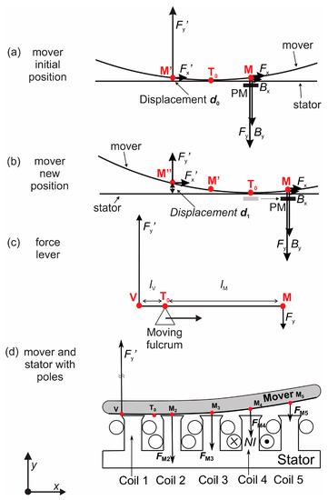 0 between the stator and the mover represents the fulcrum (i.e., pivot point) moving from the point V up to the point M, the effort force is the electromagnetic force