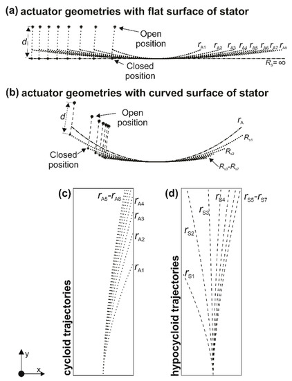 Figure 1b) and by using the normal component of magnetic flux density. The new actuator geometry design is based on the theoretical analysis of the electromagnetic and mechanical properties of a circle shaped object moving/rolling on a fixed (not moving) surface, which may be either flat or curved. The moving object represents the mover of the actuator and the fixed object presents the stator with the source of magnetic flux density, as illustrated in