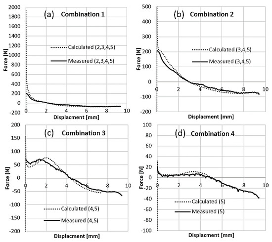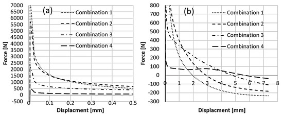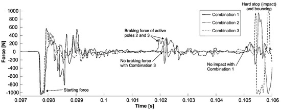 Figure 5a–c, where zero force crossing depends on excitation Combination, therefore the breaking occurs at a different displacement. As a result of energized Combination 1, the breaking occurs after 2 mm of displacement, while at Combination 2, breaking occurs after 3 mm, and with energized Combination 3, the breaking appears after 4 mm of displacement. During the mover rocking movement progress the mover barycentre is changing, which results in an increasing of active inertia. The accumulating force is adding to the acting electromagnetic accelerating force obtained with Combination 3, which results in higher accelerations and in higher decelerations during the impact.