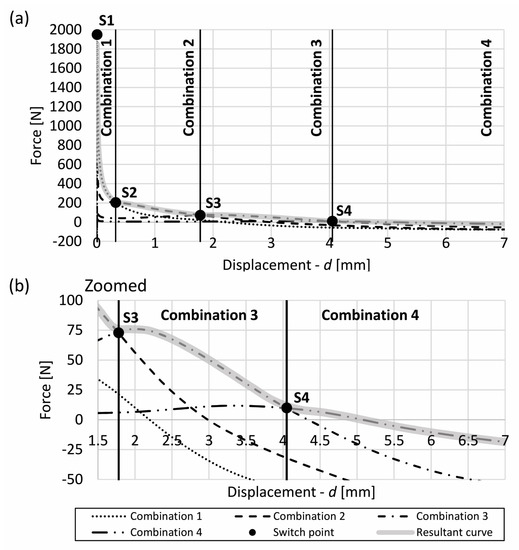 d) can be designed/shaped by combining different coil activation (i.e., by switching on and off the coils of the five actuator phases). The resulting force-displacement characteristic (grey curve) that was obtained with different coil combinations is shown in