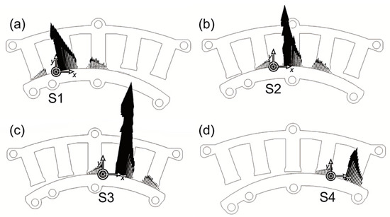 2) distribution in the XY cross section view and the actuator displacements obtained at four different characteristic coil switching points S1, S2, S3, and S4 are shown in