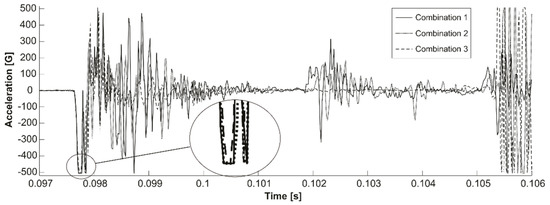 Figure 10 indicates that the initial measured acceleration was above the accelerometer range, which means that the actual acceleration during the experiments clearly exceeded the maximum value of 500 G. The experimental results are shown for the actuator accelerations that were obtained with the Combination 1 (active coils 2, 3, 4, and 5), Combination 2 (active coils 3, 4, and 5), and Combination 3 (active coils 4 and 5). The last case when only the phase 5 was active is not shown due to the fact that a very small force was produced, due to a very large air gap forming below the pole 5 within the starting position of the mover.