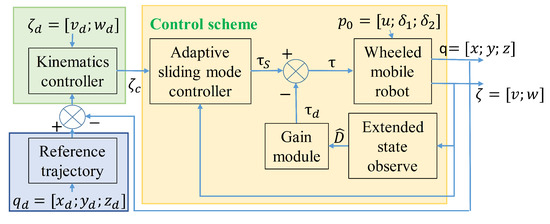 For the WMR considering skidding and slipping, the block diagram on the implementation of the proposed ESO-ASMC is given in Figure 2.