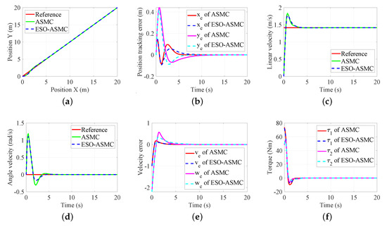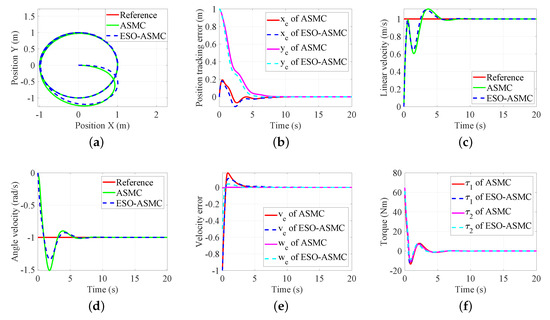 From simulation results in Figure 3, we can see that the ESO-ASMC scheme has higher tracking performance in trajectory and velocity tracking compared with the ASMC, and more robust to disturbance attenuation for the WMR. Due to the slipping and skidding occurs in the movement, it can directly influence the WMR to track the desired linear trajectory shown in Figure 3a. With the ESO-ASMC controller, the WMR can track the desired trajectory more rapidly and have faster convergence on position tracking error than the ASMC strategy as shown in Figure 3b. It is noted that the position tracking error of ESO-ASMC is smaller than that of ASMC. Besides, it is shown the linear velocity in Figure 3c is perturbed during the movement together with the angular velocity in Figure 3d. And the linear and angular velocity tracking error of ESO-ASMC scheme converges to zero more rapidly than that of ASMC in Figure 3e. The input torque fluctuation of ESO-ASMC is more stable than the ASMC when slipping and skidding occurs as in Figure 3f. The ESO-ASMC method is implemented into circular trajectory, and thus the same tracking performance and disturbance attenuation effect are obtained as shown in Figure 4. In addition, to further evaluate the tracking performance of ESO-ASMC, the position tracking error is defined as . The simulation results are analyzed in terms of RSME, max error, and min error as shown in Table 3. It is clearly seen that the root mean squared error (RMSE) of the ESO-ASMC strategy is smaller than ASMC for both the linear and circular trajectory. For the linear trajectory, the max error of the ESO-ASMC is smaller than the ASMC, while the min error of the two control methods converge to zero because the trajectory with slipping and skidding can perfectly track the desired trajectory. For the circular trajectory, the max error of the ESO-ASMC is the same with the ASMC because the same max error is obtained at beginning of the trajectory, while the the min error of the both tracking approaches is also the same due to the given trajectory can track the desired trajectory well.