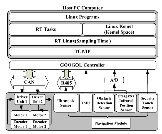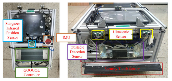 A verification platform is built up to illustrate the ESO-ASMC controller in motion control of WMR with skidding and slipping. The experiment platform consists of two direct motors with absolute rotary encoder, a stargazer infrared position sensor, IMU, obstacle detection sensor, ultrasonic sensor and security touch sensor, as displayed in Figure 5. The IMU is used for collecting the WMR’s current orientation, while the absolute rotary encoder for collecting the position. The specific implementation architecture of WMR is depicted in Figure 6.