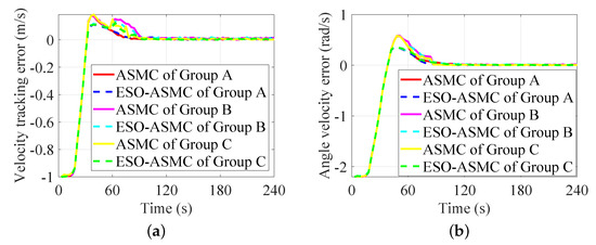 The experimental results present a similar tendency for the Group A, B, and C, the position tracking precision of the ESO-ASMC scheme is all superior to the ASMC scheme in Figure 7 and Table 4. In the first 60 s, the WMR is required to adjust the orientation angle to track the reference trajectory, thus it leads to the max tracking error in Table 4 for the Group A, B, C. When the slipping and skidding phenomena occurs in the about 60 s, it have negative affects on the real trajectory and velocity. In the Figure 7, it is clearly seen that the max error of the ASMC scheme during slipping-skidding is 0.111 m, 0.235 m, 0.143 m for the Group A, B, C, while the max error of the ESO-ASMC scheme is 0.105 m, 0.207 m, 0.139 m. Despite the experiment with icy ground in Group B makes slipping and skidding phenomena more obvious, the position error in Figure 7b and the RMSE in Table 4 of the Group B present slightly larger comparing with the Group A in Figure 7a and Group C in Figure 7c. Besides, it is noting that the motion of WMR in Group B need similar time to track the reference trajectory in the experiment process. The reason for this phenomenon is that the slipping and skidding as an external decreases the velocity of WMR, thus the controller is required to adjust input component to compensate this deviation due to the wheel slipping and skidding. With the effect of the controller, the min error for both ASMC and ESO-ASMC methods all converge to zero for the Group A, B, C during the whole motion. Although the linear velocity error in Figure 8a and angle velocity tracking error in Figure 8b are a bit larger than the result of Group A and Group C, it suggest that the ESO-ASMC approach in three experimental cases all perform better than the ASMC approach. It indicates that the ESO-ASMC approach has better robustness against disturbance compared with ASMC approach under different working condition. This is consistent with the simulation results. It can be concluded the ESO-ASMC method has certain practicality to the wheel slipping and skidding with the different ground condition and thus can realize the adaptive tracking ability.