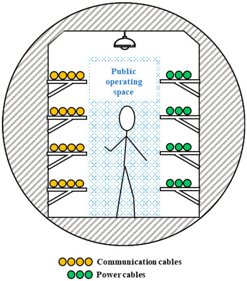 Generally, the more pipelines are laid in the UUT, the more the underground space is needed and the higher the construction cost becomes. As a result, the SPM is proposed to allocate the construction cost based on the proportion of area occupied by the pipelines, which includes the cross-sectional area of the pipeline itself and the required operating space for its installation and maintenance. The cross-sectional structure of UUT laying power cables and communication cables is shown in Figure 1. Apart from the space occupied by systems such as ventilation, lighting, and firefighting, the space of the UUT is mainly composed of the power cables, communication cables, and their public operation space (indicated by blue shadows).