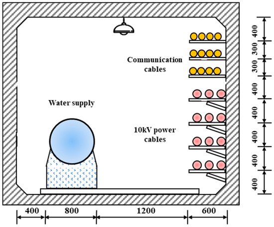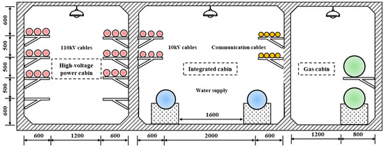 It is worth noting that the construction costs of UUT projects in different regions can vary hugely, which may be caused by the difference of cabin types and regional economic development [11]. To further prove the effectiveness of the proposed comprehensive decision-making cost allocation mechanism, the UUT project in Ningbo City, Zhejiang Province, China, is also used for demonstration [28]. The cross-sectional view of utility tunnel of Yincounty Avenue in Ningbo is shown in Figure 9. It is an integrated cabin in which 10 kV power cables, communication cables, and water supply pipelines are laid, while 110 kV cable and gas pipeline need not be laid. The total investment in construction is 60 million CNY per kilometer, 40% of which is funded by the government. The engineering parameters of the tunnel and pipelines are shown in Table 5.