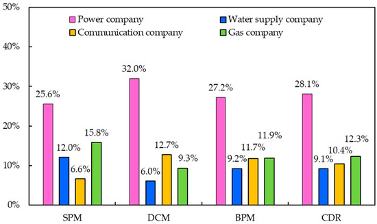 (3) Under BPM, the cost allocation proportion of each pipeline company is determined according to the economic benefit that the pipeline produces when laid into a utility tunnel. For power companies, the total cost of cable laying is reduced because the utility tunnel replaces the traditional underground power corridor that requires additional investment in construction, resulting in the highest economic benefits for the power companies. On this basis, the cost allocation proportion of power companies is the highest (i.e., 28.1%). For water supply and gas companies, compared with the traditional buried pipelines, UUT-laying pipelines have a lower laying cost, maintenance cost and repeated laying frequency, which increases their economic benefits. Therefore, the costs shared by water supply companies and gas companies under BPM are higher than those shared under other methods.