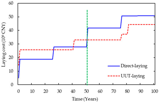 It is worth noting that the service life of traditional buried cables and UUT-laying cables are different, which makes the time point of cable re-laying different. Therefore, the cumulative laying cost of UUT-laying cables may be lower than that of the traditional buried cables during a certain period, but the power company cannot recover the allocated UUT construction cost. Take a 10 kV power cable as an example, due to the improvement of environmental conditions, the average service life of the UUT-laying cable is 40 years, 15 years longer than that of the traditional buried cables. It can be seen from Figure 5 that in the first 25 years, the UUT-laying cost curve is always higher than the direct-laying cost curve. Within the payback period, the traditional buried 10 kV cables need to be re-laid in the 26th and 51st years at a cost of 9 million CNY per time, while the UUT-laying 10 kV cables only need to be re-laid in the 41st year at a cost of 7.2 million CNY. As a result, in the 15 years period from the 26th to the 40th year, the UUT-laying cost curve is lower than the direct-laying cost curve, but in fact the cost shared by the power company is not offset. After the 51st year, the UUT-laying cost curve is always lower than the direct-laying cost curve, which shows that the power company has completed cost recovery.