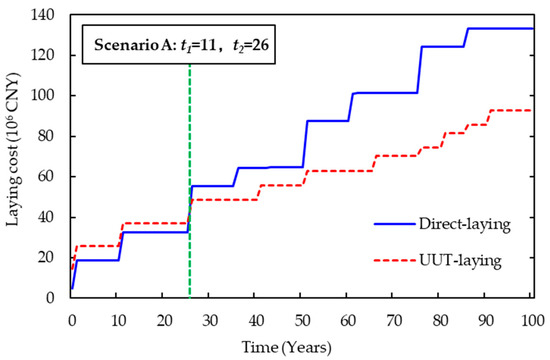 It is important to assume that due to the increase of load in the UUT pilot area, the distribution network needs to double its capacity in the t1-th and the t2-th year after cable laying. The capacity of other types of pipelines has also increased at the same time, and cost allocation proportion of each pipeline company remains unchanged. Then, considering the expansion of distribution network, the cost comparison of traditional buried cables and UUT-laying cables under two scenarios is shown in Figure 6 and Figure 7, respectively.